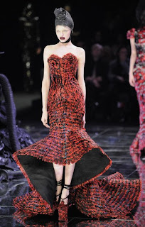 This is Alexander McQueen, waving and smiling at the cheering fashion crowd at his latest show for Paris fashion week earlier this month. Although he may look like the local school caretaker, you certainly couldn't mistake his unbelievable tailoring and use of texture and colour that we have grown to love and admire every season. Once again, the female silhouette was perfectly framed by his flattering creations, and although a lot of this collection slanted towards the monochrome palette which has proved popular with many of the designers recently, the bold colours that he also used help to create the sense of 'reinvention' he was hoping for.