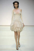As for Mark's summer collection, his inspiration was apparently Erin Brockovich but to me he produced another knit range very much from his own head. The first half of the show focused on powder colours, and finished with black. Petal-like objects cascade down skirts and dresses, feathers make a very welcome appearance, even chains on the last look of the collection. My hat comes off to Fast for his choice in model size, however I do think he might need to step it up a bit next season. A little surprise goes a long way.