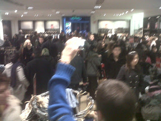 The worst was Zara. They have, for some reason, morphed into Primark for their sale - rails and rails of limp-looking clothes, crying out for attention but with no room anywhere to pull them off. The pic shows a bit of the carnage. 'I'm a blogger, get me outta hereee'.