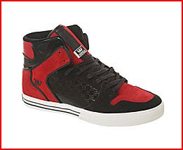 Mixed-knit cardi, Zara £49.99; red/black Supra high tops, Offspring £89.99
