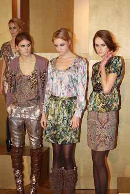 Clements Ribeiro - I'm loving the new collection of Ribeiro prints and textures. From the live presentation I saw brocade, metallics, silk, knits and fur. We've come to expect something from Ribeiro - not entirely sure what - but we certainly get it from his collection. Carefully embellished knits won me over, as did the swirly, dream-like green dyed prints. Yum!