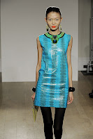 The above jumpsuit was my fav look by far, however over the top it may be. One of her inspirations was pythons, which was perfectly evident in the pink snakeskin that opened the show. Fur and suede were also used to rouse the senses even more than usual. Another inspiration was telephones, hence the muted-yellow telephone dress and the black trousers emblazoned with a white telephone. YUM!