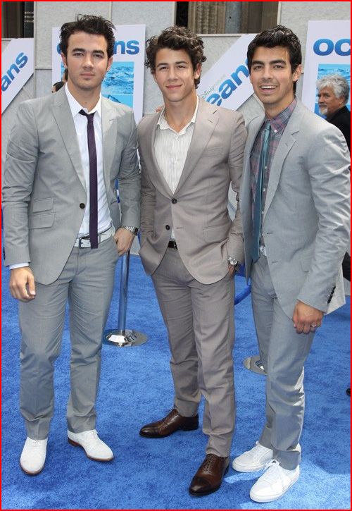 It's rare that I comment on a matching suit ensemble (I think the last time was Westlife in their silvery-grey Armanis), but here, at the premier for new Disney flick 'Oceans', the Jonas brothers do look endearingly sweet don't they? In their light pastel hues, each with a different shirt and shoe combination, they have taken teen-Disney-cute to the max.