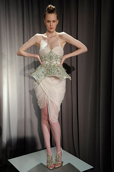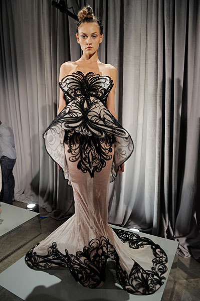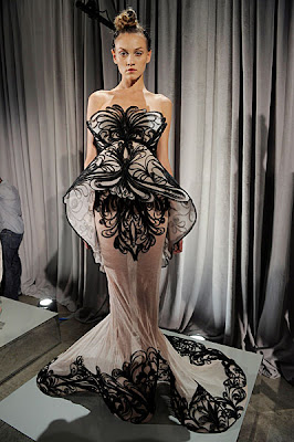 Tulle, chiffon, lace, spider-web detailing and laser-cutting - all in one breath for Marchesa. Huge skirts on romantic gowns, draping on shorter dresses and evening harem jumpsuits, hand-painted wonders that resembled a stare-for-hours work of art and stiffened shapes that can only be described as Marchesa Magic.