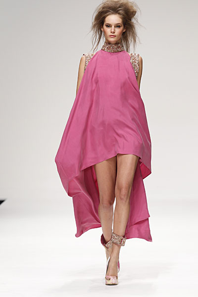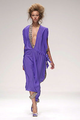 Anyway, give me a collection that involves shades of purple (my favourite colour), some draping and knotting (my preffered detailing) and an Indian undertone (the colours and music are uncomparable) and you've got my attention. The Indian jeweled/beaded cuffs that attached ankles to trouser legs and wrists to sleeves were a charming detail, as was the gold leaf detail on the model's bodies.