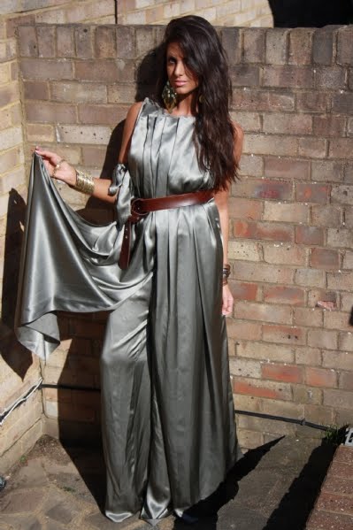 So here's my styled up glam-suit, as modelled by Jade (isn't she gorgeous??). I used my own brown Vivienne Westwood belt to break it up and just simple gold bangles, lots of them, and some statement earrings to accessorise. Hope you like!