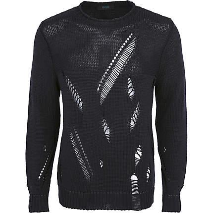 Cotton trousers with braces, £29.99 Zara; navy tape laddered jumper, £39.99 River Island