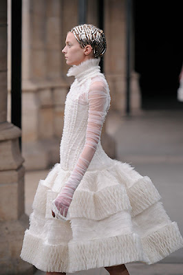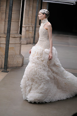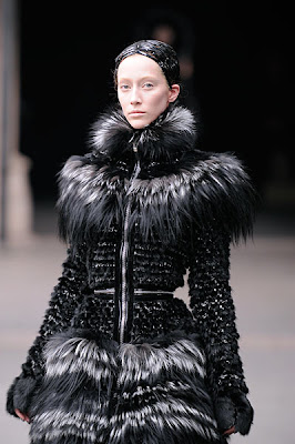 ***Sarah Burton's second collection is, I'm sure ya'll agree, a triumph by anyone's standards. Ice queen high collars and Elizabethan silhouettes were contrasted yet complimented by movement throughout - in fur, froths of tuelle and intricate chiffon. She is most definitely queen of couture, in true McQueen style. Can't wait to see what she has in store for Kate Middleton!***