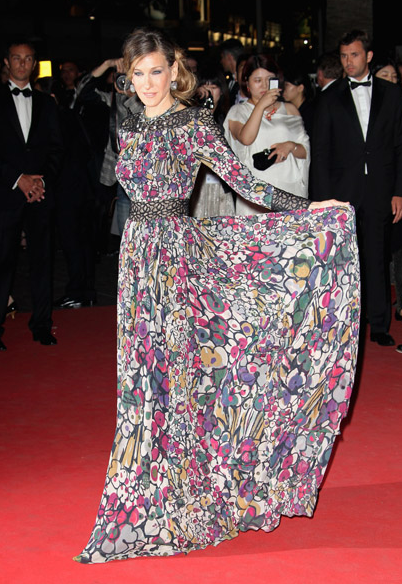 Sarah Jessica Parker always looks good. But sometimes she gets it SO right. This is one example. SJP stepped out in an over-printed, cinched in at the waist, to the floor Elie Saab gown that, as you can see from the pictures, not only made her look 10 feet tall, but moved like a dress should.