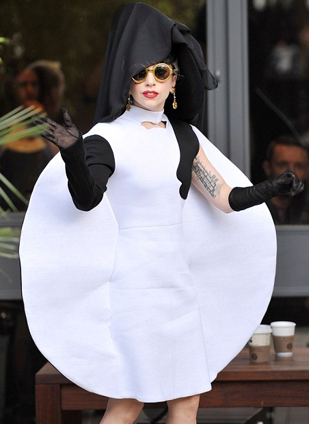 It's Sister Gaga. To me it's actually a cross between a massive circular handbag (there's even a handle) and a flying rodent. Either way, Sister Gaga works it in her really bizarre, weird, fashion-forward way.