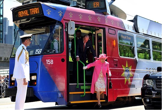 Apparently this was the first time since 2002 the Queen had ridden a tram - the last time was in Manchester. Something tells me this one was more exciting... seeing as it also had her initials on the extra little screen at the top!