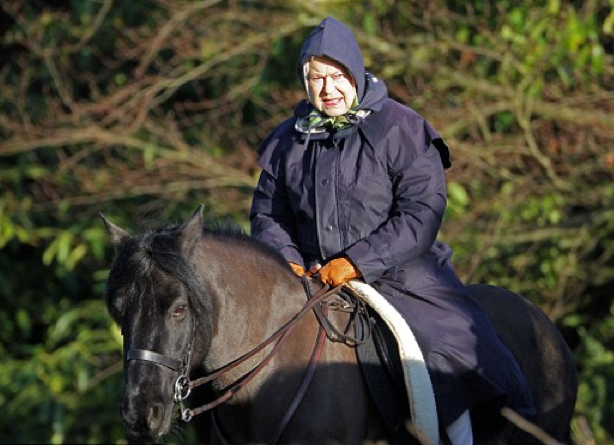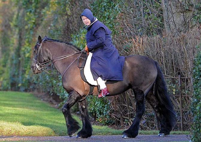 I watched 'The Queen' starring Dame Helen yesterday, so scenes of HRH in a headscarf are still fresh in my mind. Helen Mirren doesn't actually go horse riding, yet there are plenty of outdoor shots of her: stalking, walking the dogs, crying to herself when the car breaks downs. One presumes HRH has done/does one or more of these things in real life, and seeing her like this, vulnerable and essentially alone (save for a suited and booted groom), adds to her realness.