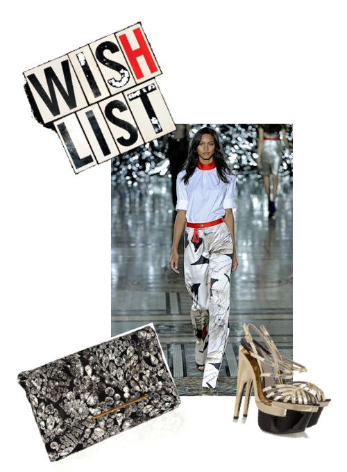 *Giles Deacon's white and red trim blouse and AMAZING swanprint trousers**Lanvin's diamond print clutch**Versace's skyscraper heels* Leave a comment