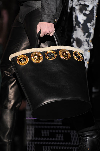 You think she's playing it safe with the first look, a pinstripe suit, but woe betide he who thinks it will be a safe collection. Before you know it we are right back to were the fashion house started - pure excess and colour. Big cartoon-y floral prints in blues, monochrome, camouflage and multi, big fluorescent fur and shearling collars on pierced leather jackets, and chains and adornments to denim and coats that only add to the campness. A rather light hearted salute at the Navy officers uniform one would say.