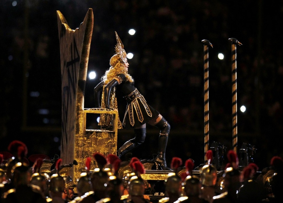 Never mind the Givenchy couture Madonna chose to wear for Super Bowl Sunday (which, by the way, was so overly amazing - she looked like a knock out - good job Ricardo Tisci!), it was all about her custom made throne that she stood, sat and rithed on as she was dragged out onto the stage by a gaggle of rather hunky gladiators!