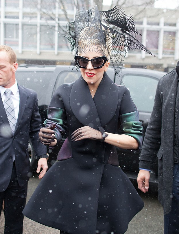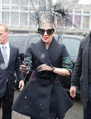Here's Gaga yesterday arriving at Harvard University to launch her Born This Way foundation, wearing the most gorgeous Prabal Gurung autumn winter 2012 coat (thanks Red Carpet Fashion Awards) with iridescent greeny-purpley sleeves, looking more like Isabella Blow then ever before!