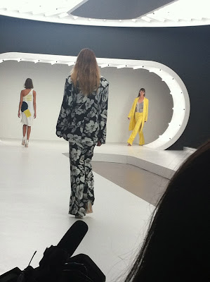 Topshop Unique's minimalism. A very monochromatic collection, with hints of yellow, next Summer is quite a move away from this season's dark, cross-influenced, heavier line. Lots of sheer too, which is quickly becoming a big recurring trend from the shows...