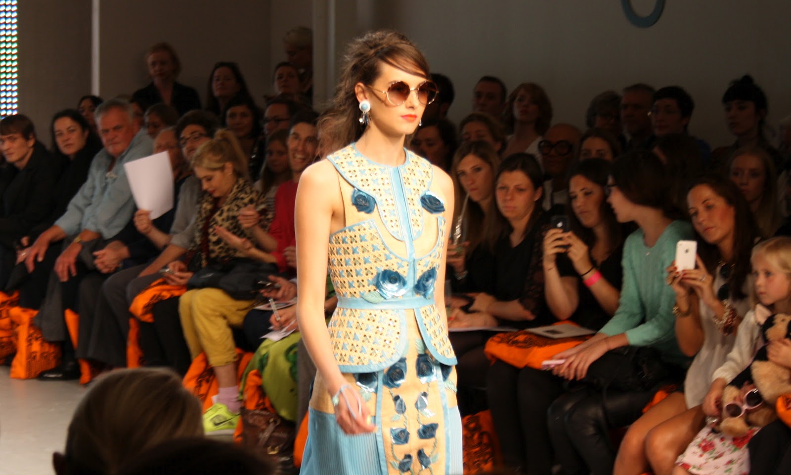 The bags made me gasp. A note book clutch, big checker board shoulder bags worn in a very Victoria Beckham grasped way and shoulder bags in cut out shapes of pineapples and a glass jar. Just wow. And I don’t usually abide trainers, but somehow they worked with these clothes.