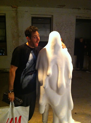 Right, down to business now. The building lent it's hand very much to the Margiela ethos and aesthetic. Each of the nine floors was designed to represent a different theme to the collaboration (which, as we know by now, is made up of signature pieces from seasons past), with crazy performance artists doing weird dances on big squares of white sand, video installations and spooky mannequins encased in the walls, almost eaten up by them. All genius ways to show off the collection.
