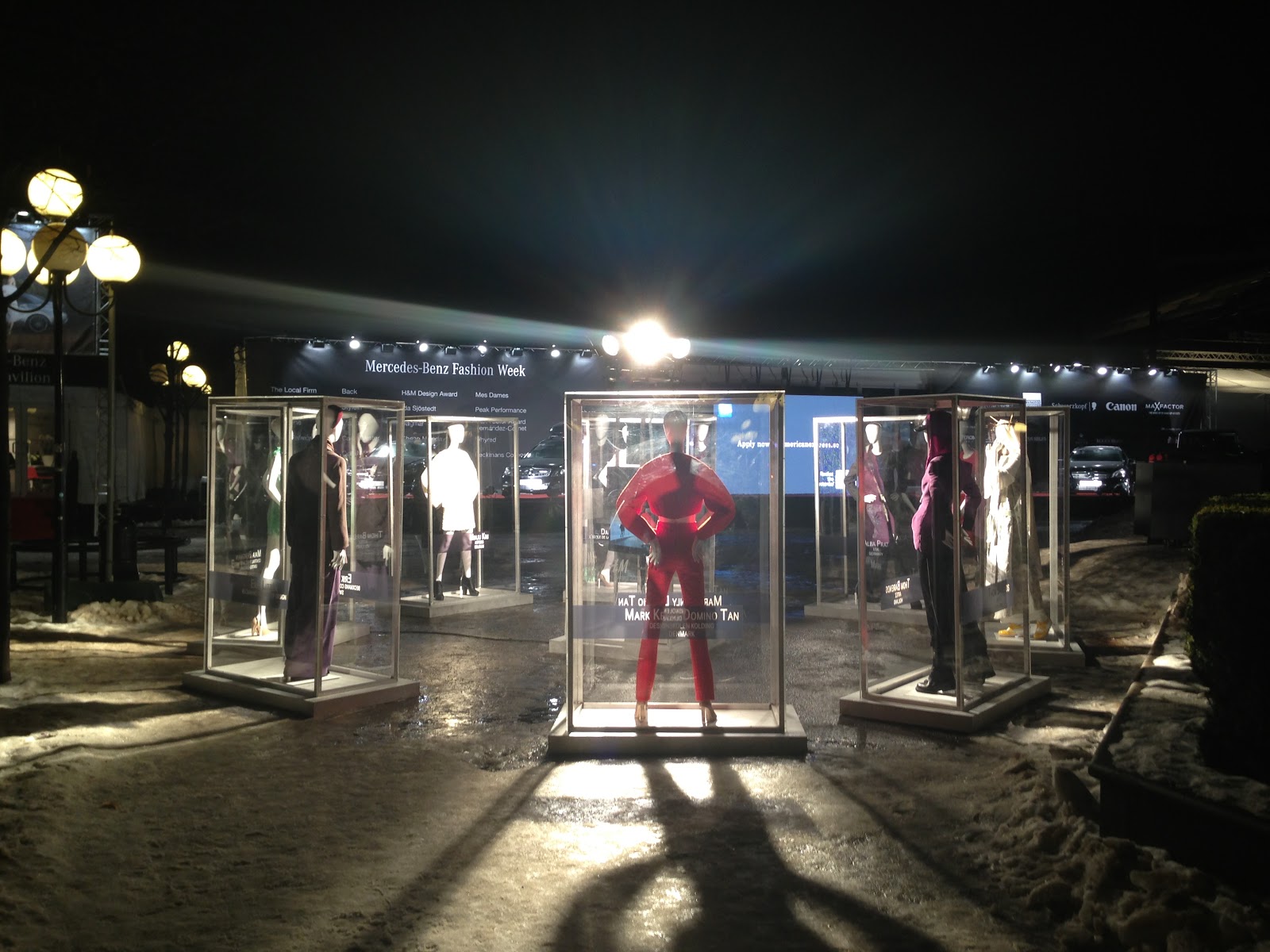 *Outside the Fashion Week tent, H&M displayed the nine finalists' designs from the Design Awards project. Was a gorgeous way to show off such talent. And yes, that IS snow!*